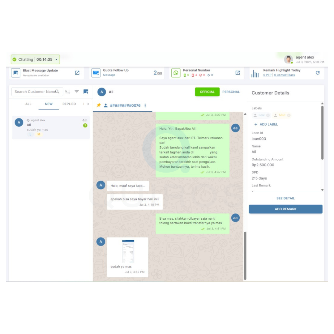 Solusi lengkap untuk mengelola pelanggan, memantau kinerja agen, mengirim pengingat otomatis, dan menjalankan campaign penagihan terstruktur dengan dukungan data real-time demi hasil penagihan yang maksimal.
